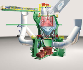 礦渣立磨機原礦渣經(jīng)抓斗機進入喂料倉,計量后由輸送皮帶送入螺旋喂料裝置喂入ZJTL輥式立磨機,在磨內(nèi)物料隨磨盤旋轉(zhuǎn)在離心力的作用下從中心向邊緣移動,經(jīng)過壓實、脫氣、粉磨過程后,物料在磨盤邊緣被從風(fēng)環(huán)進入的熱風(fēng)帶起,并瞬間烘干,較細(xì)顆粒被帶到選粉機進行分選,粗粉返回磨盤再粉磨。合格細(xì)粉被帶入袋式收塵器,進行成品收集后氣粉分離。成品收集后經(jīng)輸送進入成品散裝庫,廢氣經(jīng)風(fēng)機消音后排出。部分難磨的大顆粒物料(及鐵瘤子、鐵渣)在風(fēng)環(huán)處通過吐渣口進入外循環(huán)系統(tǒng),經(jīng)除鐵后再次由提升機喂入磨內(nèi)粉磨。