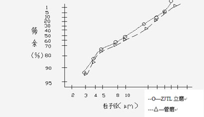 ZJTL輥式立磨機磨出的水泥制成灰漿需水量多一點,然比表面積比管磨水泥較低的情況下,凝結(jié)時間相同,抗壓強度高出15%,由此可見用ZJTL輥式立磨機磨出的水泥質(zhì)量優(yōu)于管磨水泥質(zhì)量。產(chǎn)品顆粒級配對比,結(jié)果基本相似。